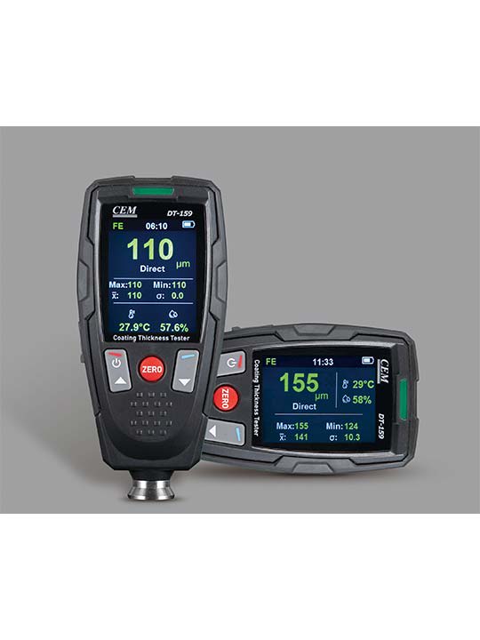 159 is a 2.4" TFT color LCD display coating thickness tester with temperature and humidity measurement. Dual Technology Features Automatic Selection of Magnetic Induction