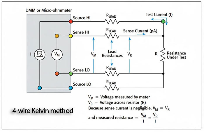 It uses the Kelvin (four-terminal) measurement method to eliminate errors caused by test lead and contact resistance.