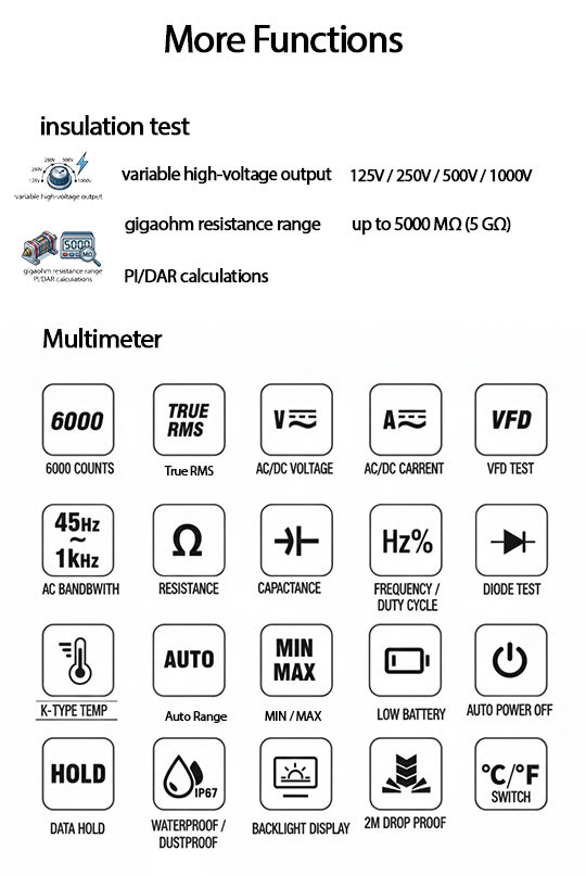 50V / 100V / 250V / 500V / 1000V suitable for sensitive electronics, low-voltage system suitable for industrial motors, cables, household wiring |