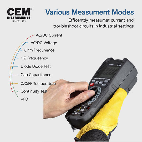 Measurement of AC/DC voltage, current, resistance, capacitance, frequency, temperature, duty cycle, and continuity, etc. |