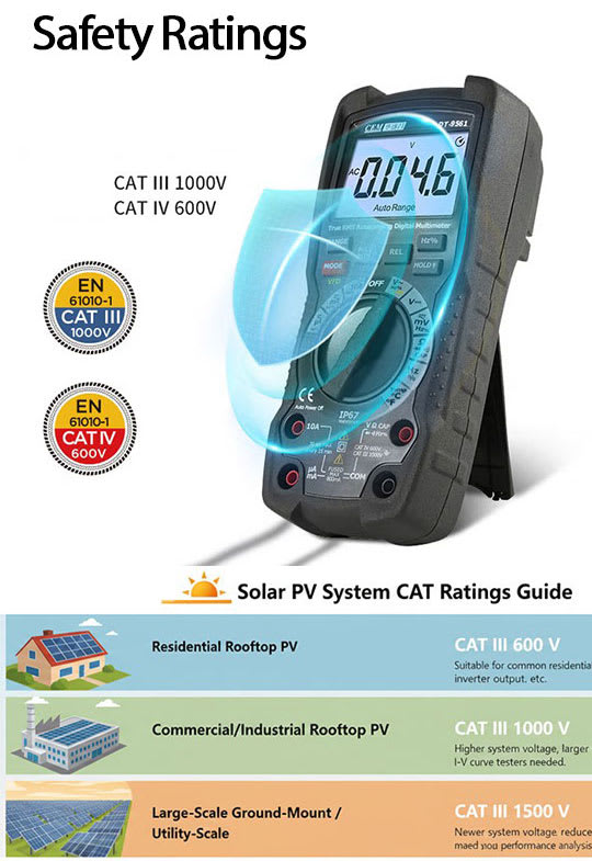 The DT-9561H photovoltaic-specific digital multimeter features high-voltage measurement capability, support 1500V DC and 1000V AC voltages to meet the voltage testing requirements of photovoltaic array systems.