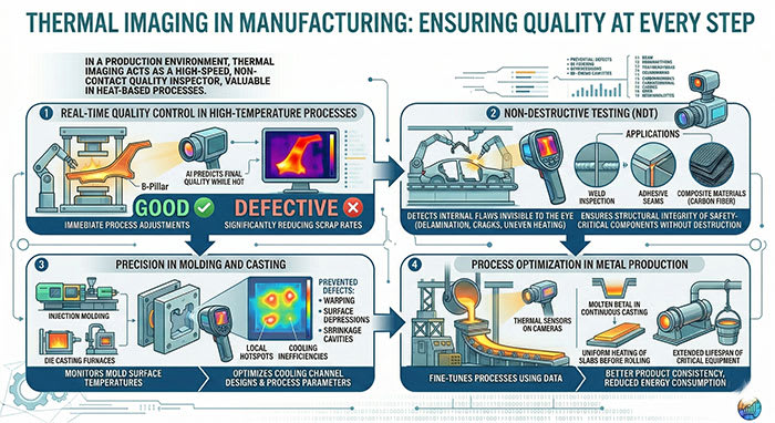 In factories, thermal imaging works like a fast, touch-free quality inspector. It is especially useful in processes that involve high heat, where normal inspection methods often do not work well.