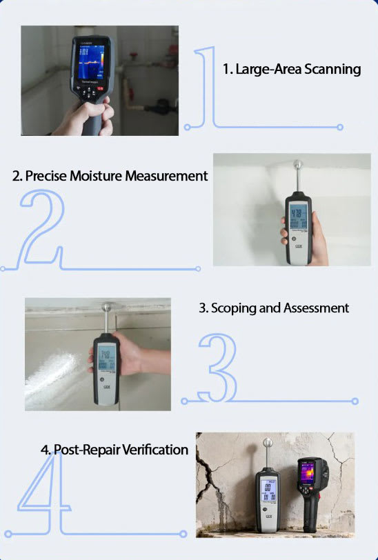 Thermal imaging cameras and moisture meters form an indispensable golden combination in modern building moisture detection and remediation. Simply put, their collaborative approach is as follows: Thermal imaging cameras handle “rapid screening” of large areas to pinpoint suspicious spots; moisture meters then perform “precise diagnosis” to confirm whether moisture issues exist at these locations and determine their severity.